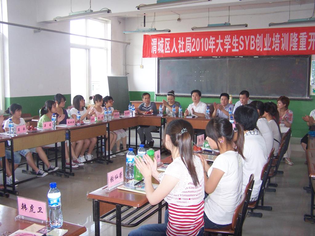 渭城区人社局2010年大学生SYB创业培训陕工职院乐鱼网页版培训班于2010年6月22日在崇文北楼402室隆重开班。乐鱼网页版党总支书记何玉辉,院团委书记闫军,渭城区人社局王科长,就业指导处牛文莉,乐鱼网页版学工办辅导员张建平,25名即将参加SYB创业培训的学生参加了开班仪式。