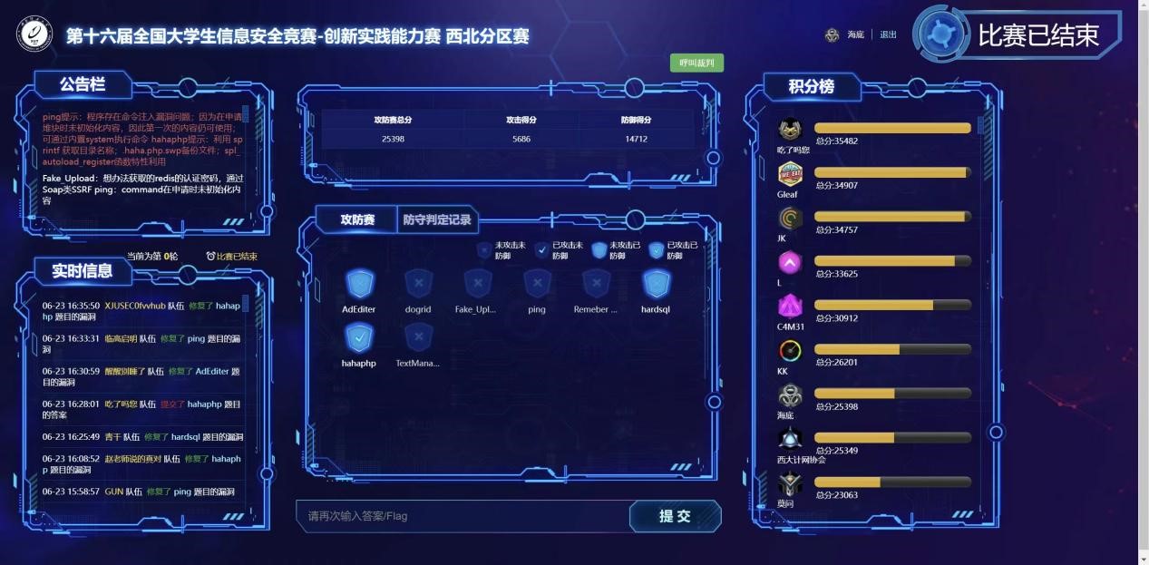 623日,2023年第十六届全国大学生信息安全竞赛创新实践能力赛西北赛区分区赛在西安理工大学举行,来自西安电子科技大学、西安邮电大学、西北工业大学、西安理工大学等30所高校,53支战队一较高下,由我院乐鱼网页版杨鹏老师指导-安全与测试工作室的成员:网络2003班豆凯歌、网络2102班刘德辉、网络5191班魏子恒、网络2102班董丹丹组成的海底战队,经过527-528日线上初赛和和623日线下区域决赛,激烈角逐,斩获分区赛一等奖,成功晋级决赛。