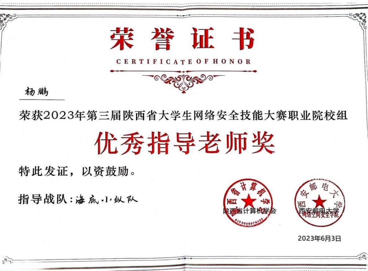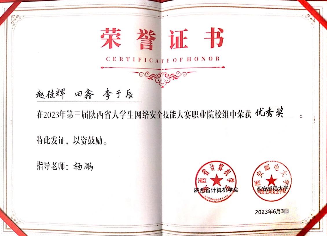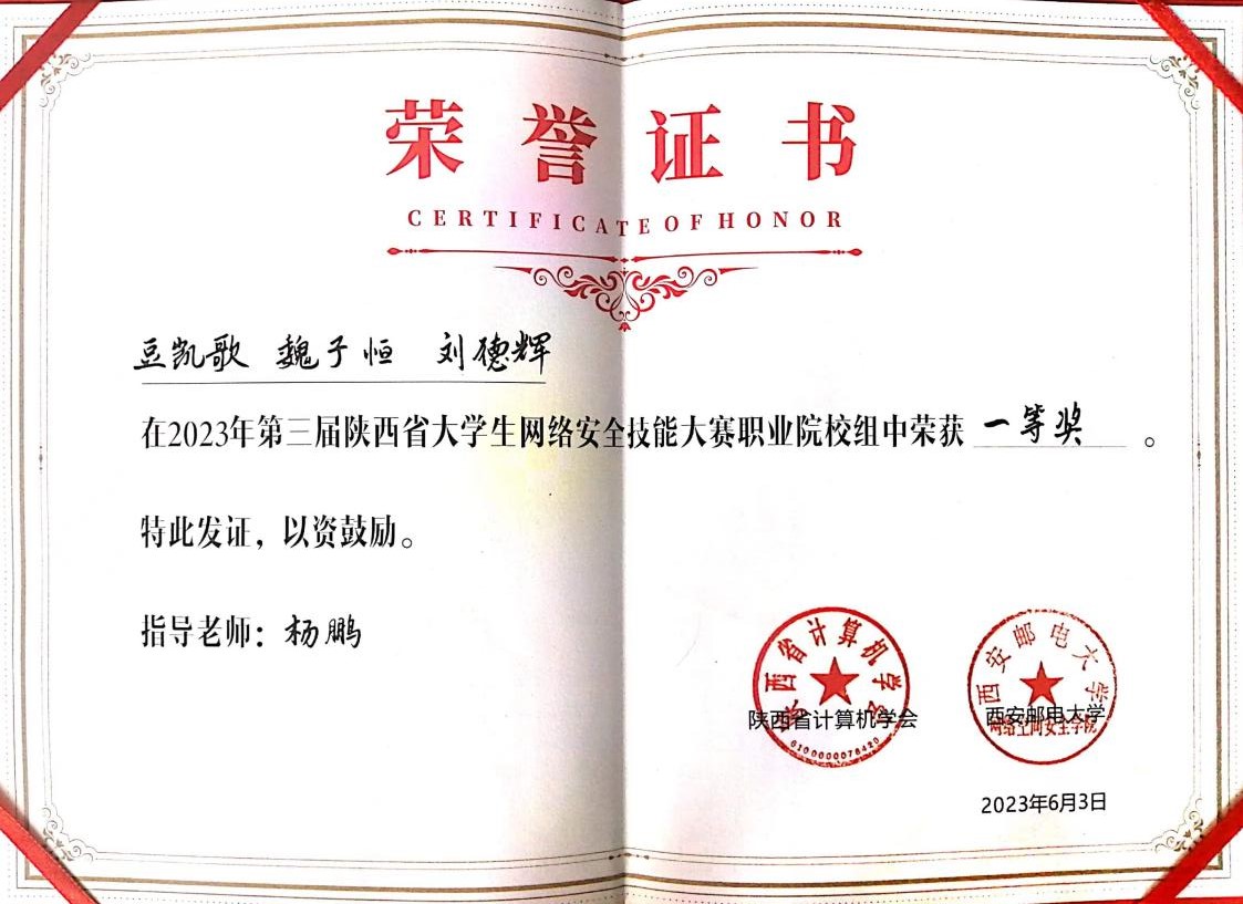 6月3日,由陕西省计算机学会主办,西安邮电大学网络空间安全学院、西安四叶草信息技术有限公司承办的2023年第三届陕西省大学生网络安全技能大赛-职业院校组在线上举行,来自全国150个高校队伍一较高下,由我校乐鱼网页版杨鹏老师指导的6名同学(两个战队),荣获一等奖和优秀奖各一项。
