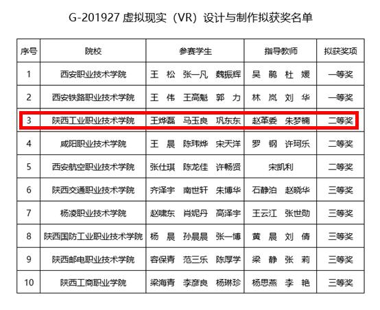 3月27日,2019年陕西省职业院校技能大赛“虚拟现实(VR)设计与制作”赛项比赛在西安职业技术学院落下帷幕。经过一天的激烈角逐,由我院乐鱼网页版教师赵革委、朱梦楠指导,软件1704班马玉良、王烨磊和数媒1704班巩东东三名同学组成的代表队荣获团体二等奖。