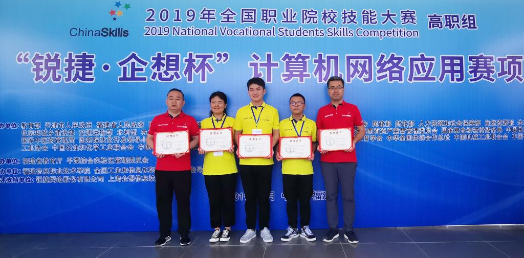 6月15日,2019年全国职业院校技能大赛高职组“计算机网络应用”赛项在福建信息职业技术学院圆满结束,大赛共有来自全国各省、市的113支代表队,共339名选手参加。经过四小时的激烈比拼,由我院乐鱼网页版教师李爱国、李文宇指导的网络1702班杨烁、网络1801班君康和信管1804班段若琳3名同学组成的代表队以总成绩第二名荣获团体一等奖。