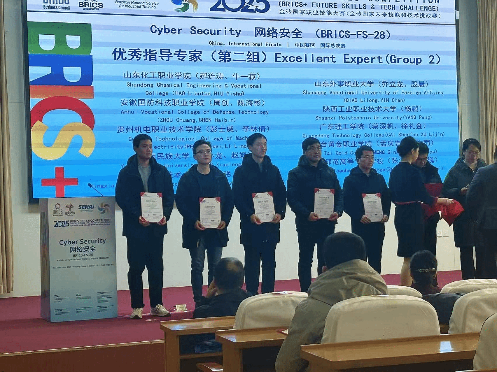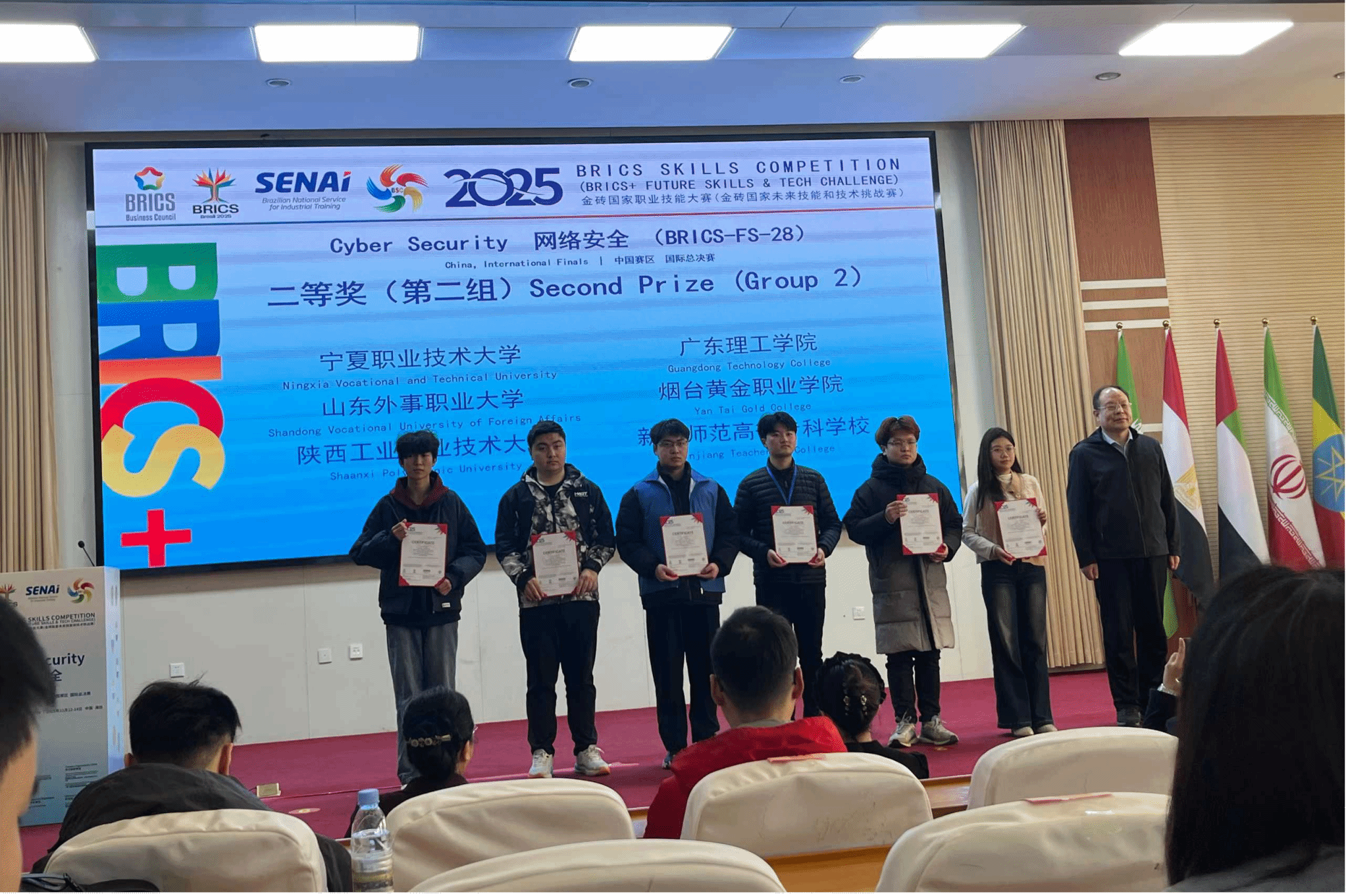 近日,我校乐鱼网页版组织学生参加2025金砖国家职业技能大赛国际总决赛,共获二等奖1项、三等奖2项,其中,杨鹏老师指导的网络2301班刘金博、网络2302班李佳乐,获“网络安全”赛项二等奖;袁辉老师指导的大数据2302班张媛媛,获“数据分析与可视化”赛项三等奖;耿倩老师指导的软件2302班匡峻磊,获“人工智能技术应用”赛项三等奖。